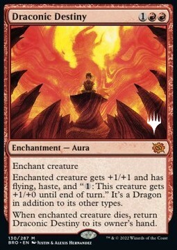 Incanta creatura La creatura incantata prende +1/+1 e ha volare, rapidità e "{1}: Questa creatura prende +1/+0 fino alla fine del turno". È un Drago in aggiunta ai suoi altri tipi. Quando la creatura incantata muore, fai tornare il Destino Draconico in mano al suo proprietario.