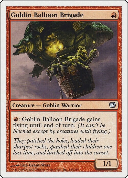• 2010-08-15 For flying to work as an evasion ability, an attacking Goblin Balloon Brigade's ability must be activated before the declare blockers step begins. Once Goblin Balloon Brigade has become blocked, giving it flying won't change that.