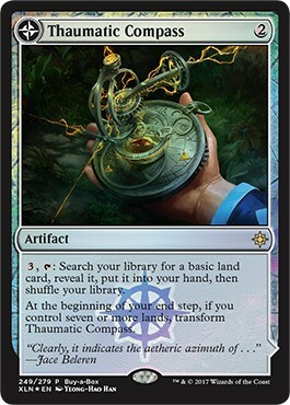 {3}, {T}: Passa in rassegna il tuo grimorio per una carta terra base, rivelala e aggiungila alla tua mano, poi rimescola il tuo grimorio. All'inizio della tua sottofase finale, se controlli sette o più terre, trasforma la Bussola Taumaturgica.