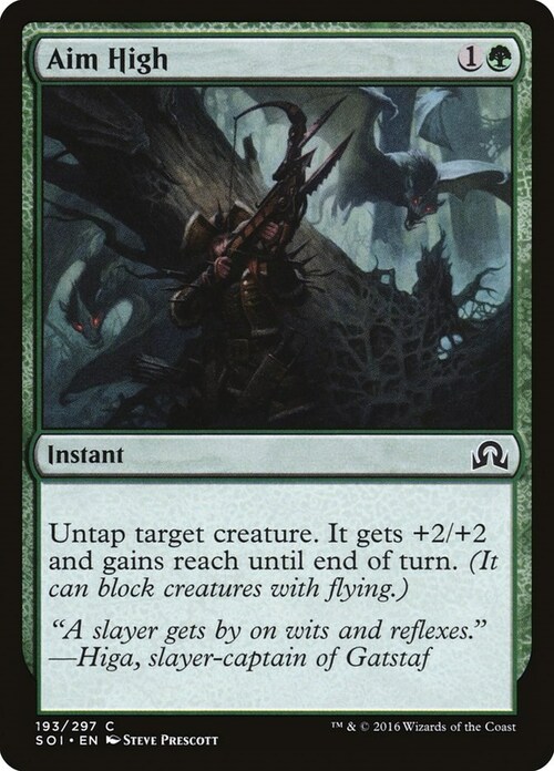 • 2025-01-24 Aim High can target a creature that’s already untapped. It still gets +2/+2 and gains reach until end of turn.