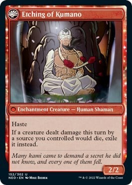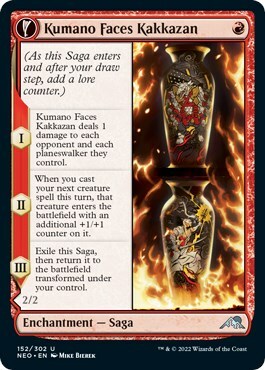 (Mentre questa Saga entra e dopo la tua sottofase di acquisizione, aggiungi un segnalino sapere.) I — Kumano Affronta Akkazan infligge 1 danno a ogni avversario e a ogni planeswalker che controlla. II — Quando lanci la tua prossima magia creatura in questo turno, quella creatura entra nel campo di battaglia con un segnalino +1/+1 addizionale. III — Esilia questa Saga, poi rimettila sul campo di battaglia trasformata sotto il tuo controllo.