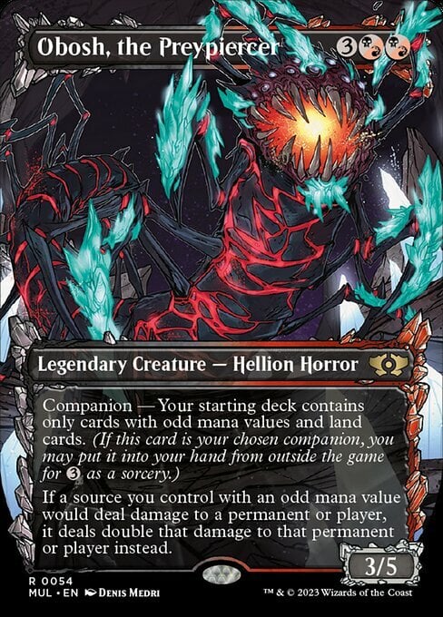 Compagno — Il tuo mazzo iniziale contiene solo carte con costi di mana convertiti dispari e carte terra. (Se questa carta è il compagno che hai scelto, puoi lanciarla una volta dal di fuori della partita.) Se una fonte che controlli con costo di mana convertito dispari sta per infliggere danno a un permanente o a un giocatore, infligge invece il doppio di quel danno a quel permanente o a quel giocatore.