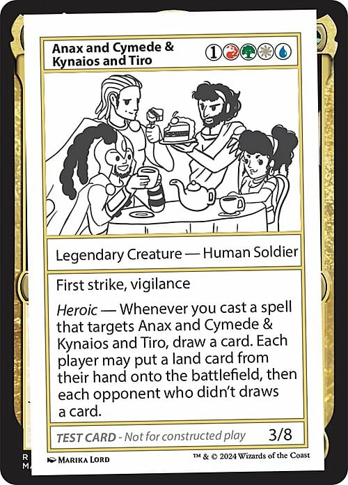 First strike, vigilance Heroic — Whenever you cast a spell that targets Anax and Cymede & Kynaios and Tiro, draw a card. Each player may put a land card from their hand onto the battlefield, then each opponent who didn't draws a card.