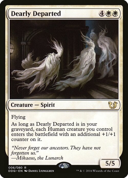 • 2011-09-22 The effect is cumulative. Human creatures you control will enter with a +1/+1 counter for each Dearly Departed in your graveyard.