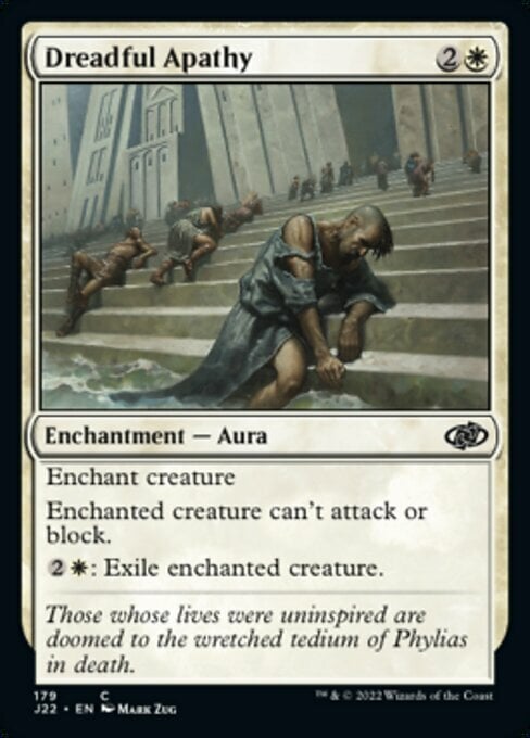 • 2020-01-24 If Dreadful Apathy leaves the battlefield while its last ability is on the stack, the permanent that's exiled is the one Dreadful Apathy enchanted before leaving the battlefield, even if that permanent is no longer a creature.