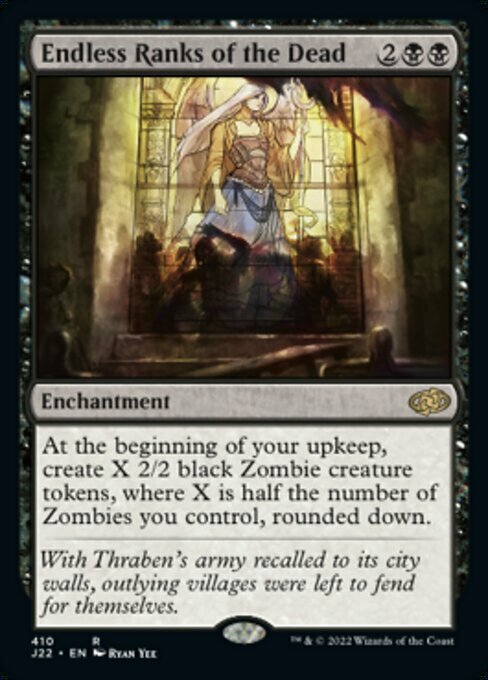 At the beginning of your upkeep, create X 2/2 black Zombie creature tokens, where X is half the number of Zombies you control, rounded down.