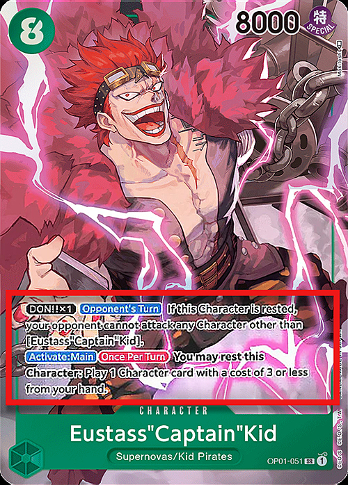 [DON!! x1] [Opponent's Turn] If this Character is rested, your opponent cannot attack any Character other than [Eustass"Captain"Kid].