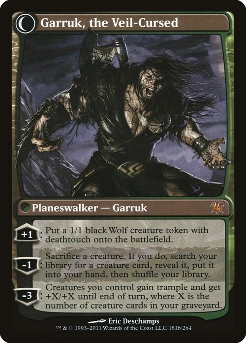 When Garruk has two or fewer loyalty counters on him, transform him. 0: Garruk deals 3 damage to target creature. That creature deals damage equal to its power to him. 0: Create a 2/2 green Wolf creature token.