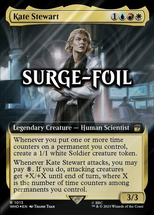 Whenever you put one or more time counters on a permanent you control, create a 1/1 white Soldier creature token. Whenever Kate Stewart attacks, you may pay {8}. If you do, attacking creatures get +X/+X until end of turn, where X is the number of time counters among permanents you control.