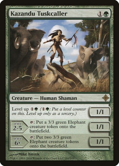 Level up {1}{G} ({1}{G}: Put a level counter on this. Level up only as a sorcery.) LEVEL 2-5 1/1 {T}: Create a 3/3 green Elephant creature token. LEVEL 6+ 1/1 {T}: Create two 3/3 green Elephant creature tokens.