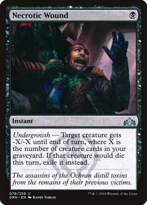 • 2018-10-05 Necrotic Wound's replacement effect will exile the target creature if it would die this turn for any reason, not just immediately after Necrotic Wound resolves.