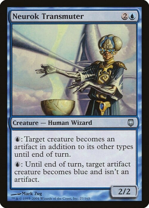 • 2004-12-01 Neurok Transmuter’s second ability interacts strangely with March of the Machines from the Mirrodin set. If an artifact is an artifact creature only because March of the Machines is on the battlefield and you then activate Neurok Transmuter’s second ability on that artifact creature, the result is a permanent with no types whatsoever. Neurok Transmuter’s ability removes the type “artifact.” March of the Machines depends on knowing what is and isn’t an artifact. The permanent won’t be an artifact when March of the Machine’s effect is applied and therefore it won’t be turned into a creature.