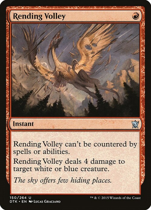 This spell can't be countered. Rending Volley deals 4 damage to target white or blue creature.