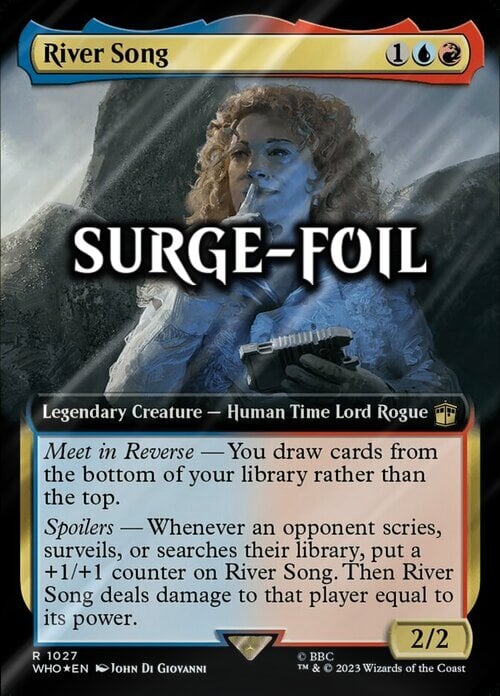 Meet in Reverse — You draw cards from the bottom of your library rather than the top. Spoilers — Whenever an opponent scries, surveils, or searches their library, put a +1/+1 counter on River Song. Then River Song deals damage to that player equal to its power.