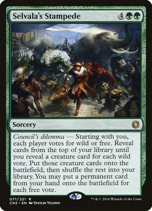 Council's dilemma — Starting with you, each player votes for wild or free. Reveal cards from the top of your library until you reveal a creature card for each wild vote. Put those creature cards onto the battlefield, then shuffle the rest into your library. You may put a permanent card from your hand onto the battlefield for each free vote.