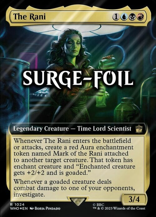 Whenever The Rani enters or attacks, create a red Aura enchantment token named Mark of the Rani attached to another target creature. That token has enchant creature and "Enchanted creature gets +2/+2 and is goaded." Whenever a goaded creature deals combat damage to one of your opponents, investigate.