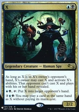 As long as X is in X's owner's opponent's hand, X's owner may cast X and activate X's abilities. That opponent can't cast X and plays with their hand revealed. {U}{B}, {T}: Put X into target opponent's hand. {3}{U}{B}: You may play a land or cast a spell from the hand X is in. If you cast a spell this way, you cast it without paying its mana cost.