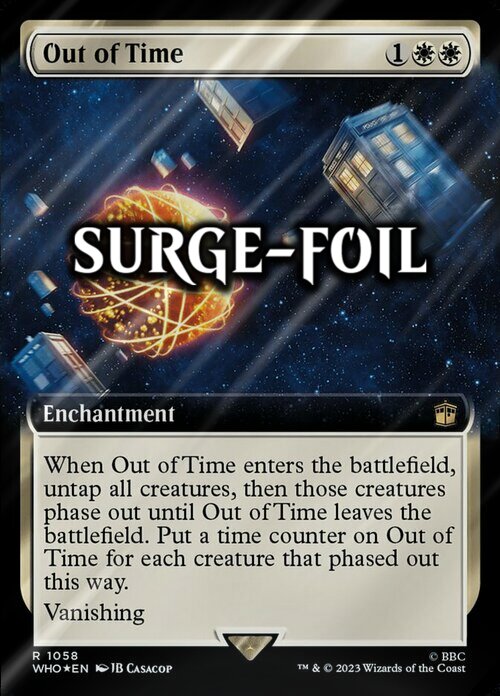 • 2021-06-18 If Out of Time leaves the battlefield before its enter the battlefield trigger resolves, creatures will untap, but they won't phase out.